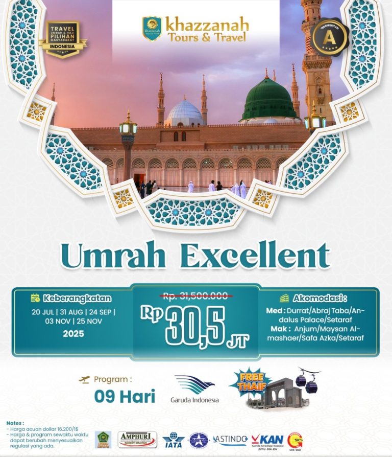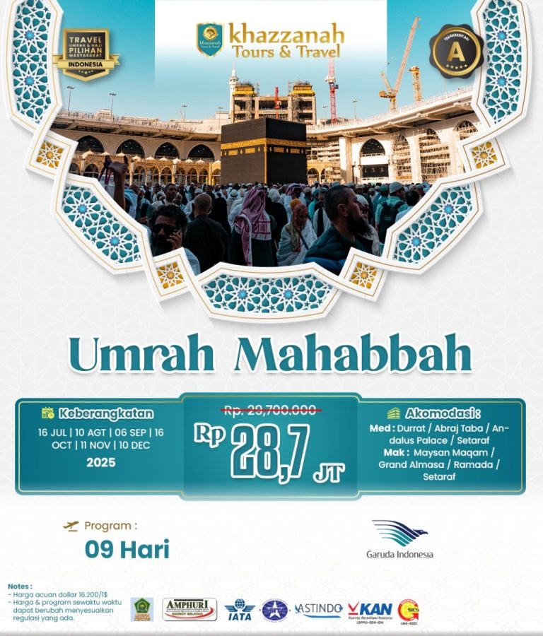 Berdiri sejak 2001 Khazzanah Tour hadir terobosan baru dalam keberangkatan ibadah umroh dan haji dengan prinsip utama “Melayani Sepenuh Hati”, sehingga nanti calon jamaah yang ingin berangkat menunaikan ibadah suci dapat memperoleh keamanan, kenyamanan, kepastian keberangkatan dan juga kenangan yang terbaik selama perjalanan tersebut serta mendapatkan tujuan utama yaitu mendapatkan pahala yang besar dalam umroh yang mabruroh. Beberapa program yang telah digagas oleh Khazzanah Tour Travel diantaranya : Paket Umroh Promo, Paket Umroh Regular, Paket Umroh Plus, Haji Plus, dan lain sebagainya.